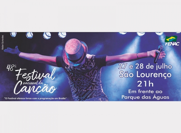 São Lourenço, no Circuito das Águas, será a primeira cidade a receber uma etapa classificatória do maior festival de música do Brasil, o 48º Festival Nacional da Canção. Ao todo, 20 músicas serão apresentadas a partir de nove horas da noite, em frente ao Parque das Águas, nos dias 27 e 28 de julho. Cerca de duas mil músicas foram inscritas no festival com ritmos e sotaques de vários cantos do país e 120 selecionadas para as etapas classificatórias. Em São Lourenço, um júri especializado irá escolher 4 músicas das 20 que serão apresentadas para as semifinais em Boa Esperança, cada uma delas garantirá, no mínimo, R$ 2.500,00. Este ano o Fenac vai distribuir R$220 mil em prêmios.