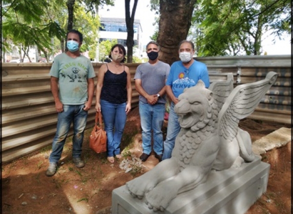 O prefeito Dr. Lessa, os vereadores William Eventos e Daniela Bacha juntamente com restaurador Rosevelt Sansão fizeram questão de tirar uma foto junto a um dos leões alados restaurados.
