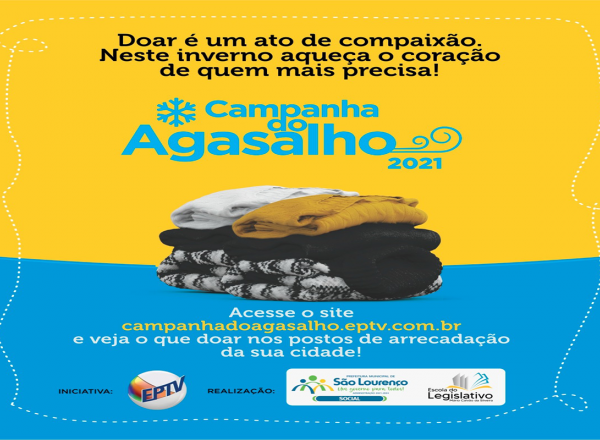 O Governo Municipal, por meio da Secretaria Municipal de Desenvolvimento Social, está integrando a Campanha Regional do Agasalho 2021 da EPTV Sul de Minas. Até o dia 31 de junho deste ano as pessoas poderão fazer doações de agasalhos e cobertores em 15 pontos de coleta distribuídos em toda a cidade.