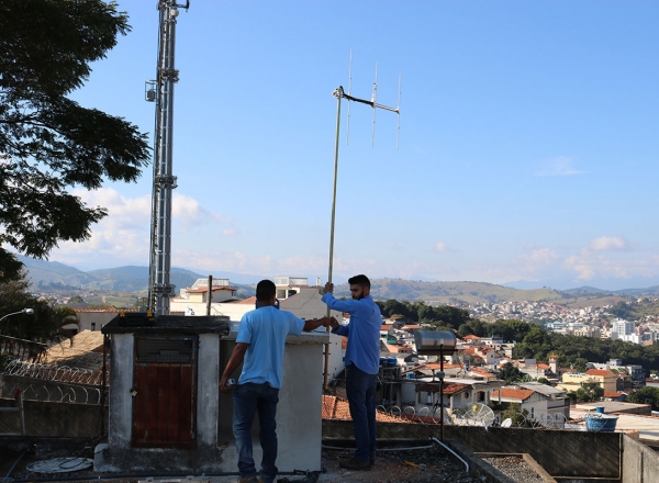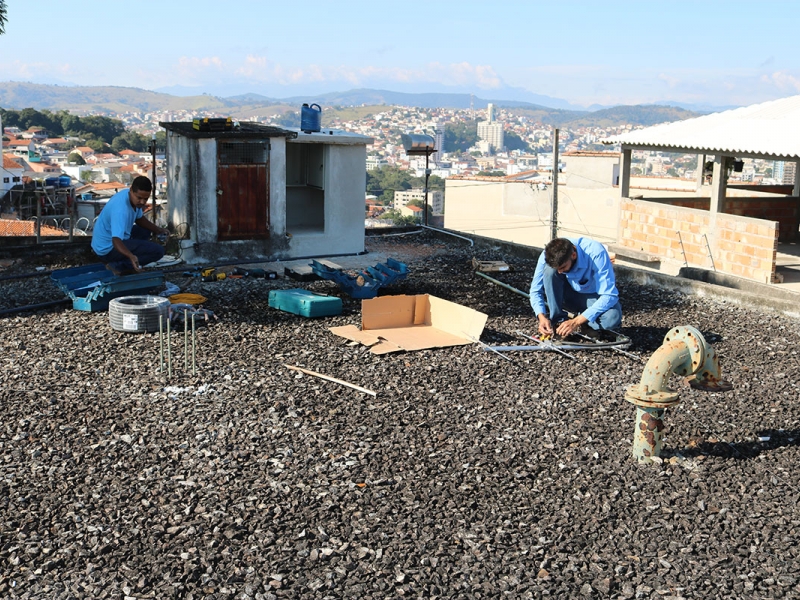 água tratada na cidade. Os técnicos estão instalando as antenas de rádio e o