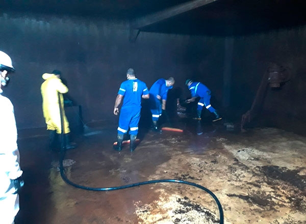 fazem a limpeza das paredes e chão do reservatório com pressão.