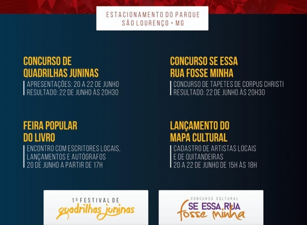 Junto a essas ações de implementação das políticas públicas, a Prefeitura Municipal de São Lourenço, através da Diretoria de Cultura, com o apoio do São Lourenço Convention & Visitors Bureau e da Paróquia de São Lourenço, traz para o feriado a apresentação e resultado dos nossos concursos "Se essa Rua Fosse Minha" e "Primeiro Festival de Quadrilhas Juninas " !
