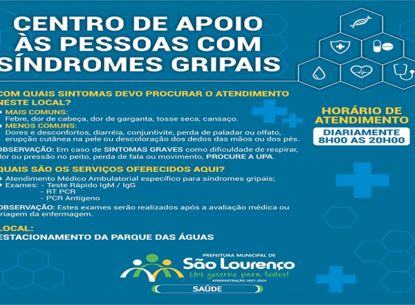 Começa a funcionar a partir desta sexta-feira (23/04) o Centro de Apoio as Síndromes Gripais no Estacionamento do Parque das Águas. O objetivo do serviço é ampliar a testagem para detectar a Covid-19 em tempo oportuno atendendo pacientes com sintomas leves e descentralizar os atendimentos das Unidades Básicas de Saúde (UBS), que possuem salas de espera compartilhadas.