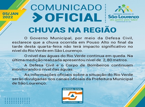 NOTA OFICIAL DEFESA CIVIL DE SÃO LOURENÇO SOBRE AS CHUVAS DA REGIÃO DIA 05 DE JANEIRO - 18H30