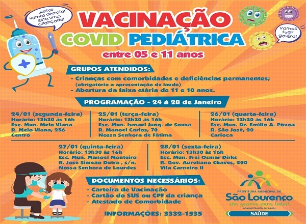 DIANTE DO CENÁRIO DO AUMENTO DE CASOS DE SÍNDROME GRIPAL E COVID, O GOVERNO MUNICIPAL POR MEIO DA SECRETARIA DE SAÚDE, VAI REALIZAR A VACINAÇÃO INFANTIL DE COVID-19 NAS ESCOLAS DE ACORDO COM O CALENDÁRIO ABAIXO, VISANDO A MAIOR SEGURANÇA E O MELHOR ATENDIMENTO DAS NOSSAS CRIANÇAS.