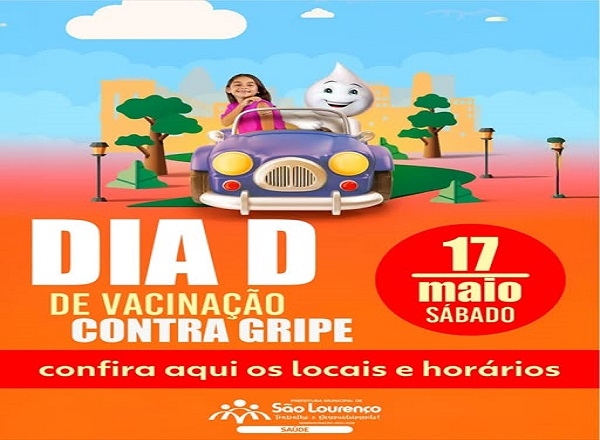 A Prefeitura Municipal de São Lourenço, através da Secretaria Municipal de Saúde informa que neste sábado, dia 17 de maio, as Unidades de Saúde da Biquinha, Nossa Senhora de Lourdes, Carioca, São Lourenço Velho, Porta do Céu, Vila Carneiro, Sonda e Centro Municipal de Imunização estarão abertas no horário das 08:00h às 17:00h para vacinação da Gripe e atualização do Cartão de vacina.