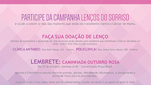 A campanha “Lenços do Sorriso” está chamando atenção da cidade de São Lourenço, que pela primeira vez, participa de um movimento como este. Uma iniciativa da Clínica Antares, com apoio da Prefeitura Municipal e Secretaria de Saúde, a campanha consiste em convidar a população para doar lenços de cabelos para as mulheres que estão em tratamento contra o câncer. Com objetivo de levantar a autoestima dessas mulheres e despertar o sorriso com este singelo presente.